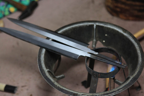 The iron tang of the blade is headed over a gas burner, avoiding the steel blade to minimize distortions, before the blade is attached to the handle