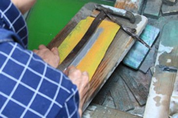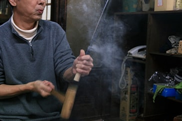 The surface of the steel blade is scrubbed using a rubber piece and powdered stone to create the hazy tarnish called kasumitoji.