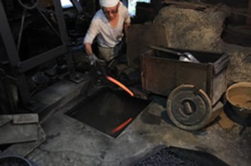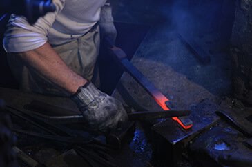 A piece of soft iron is headed until red-hot, shaped against an anvil with a hammer, and welded to the edge of the high carbon steel blade.