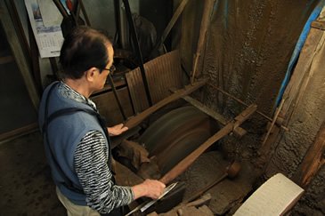 The knife is polished against a spinning sharpener made of pine tree to fix any deformations and bring out the metal's luster.